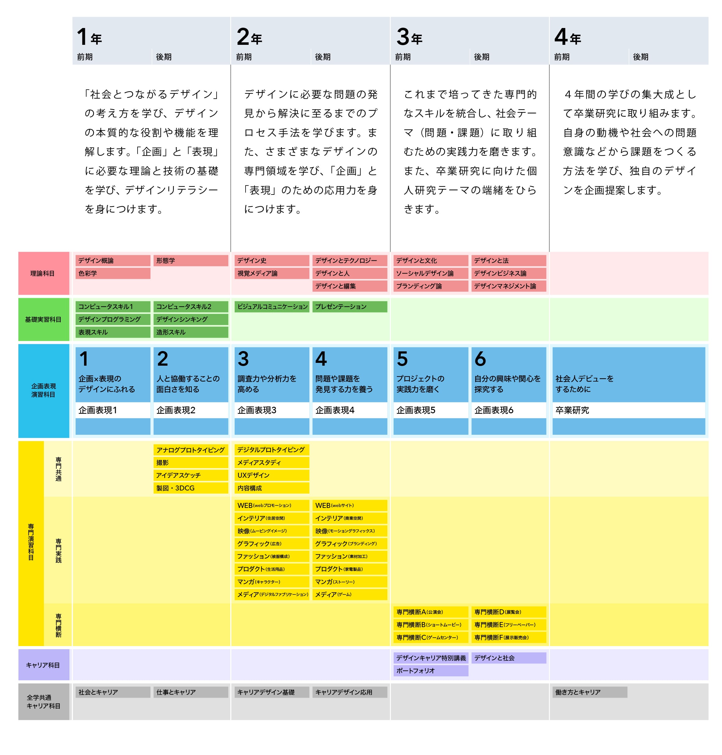カリキュラムの基幹科目として、問題や課題を発見し解決するためのデザイン手法を段階的に学びます。「社会とつながるデザイン」を具現化する姿勢と実践力を身につけます。