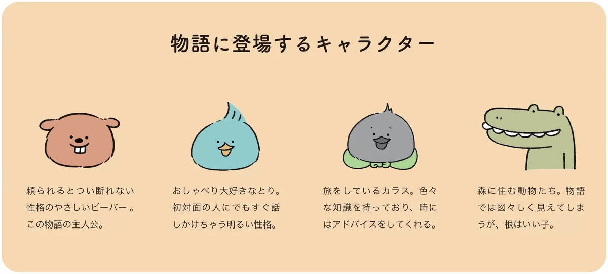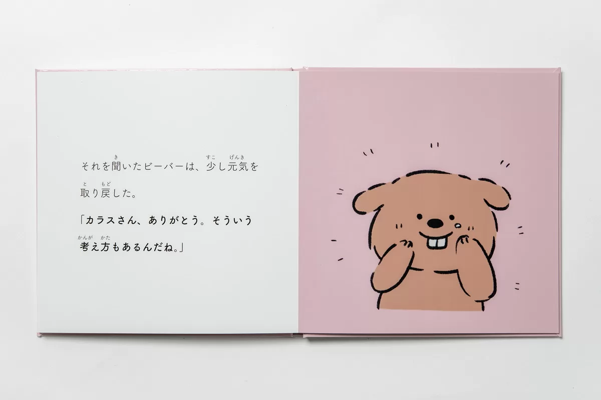 そこに1羽のカラスがやって来て心温まる助言をします。それを聞いたビーバーは元気を取り戻し、嫌だと思っていたところも自分らしさと認め、物語は完結します。