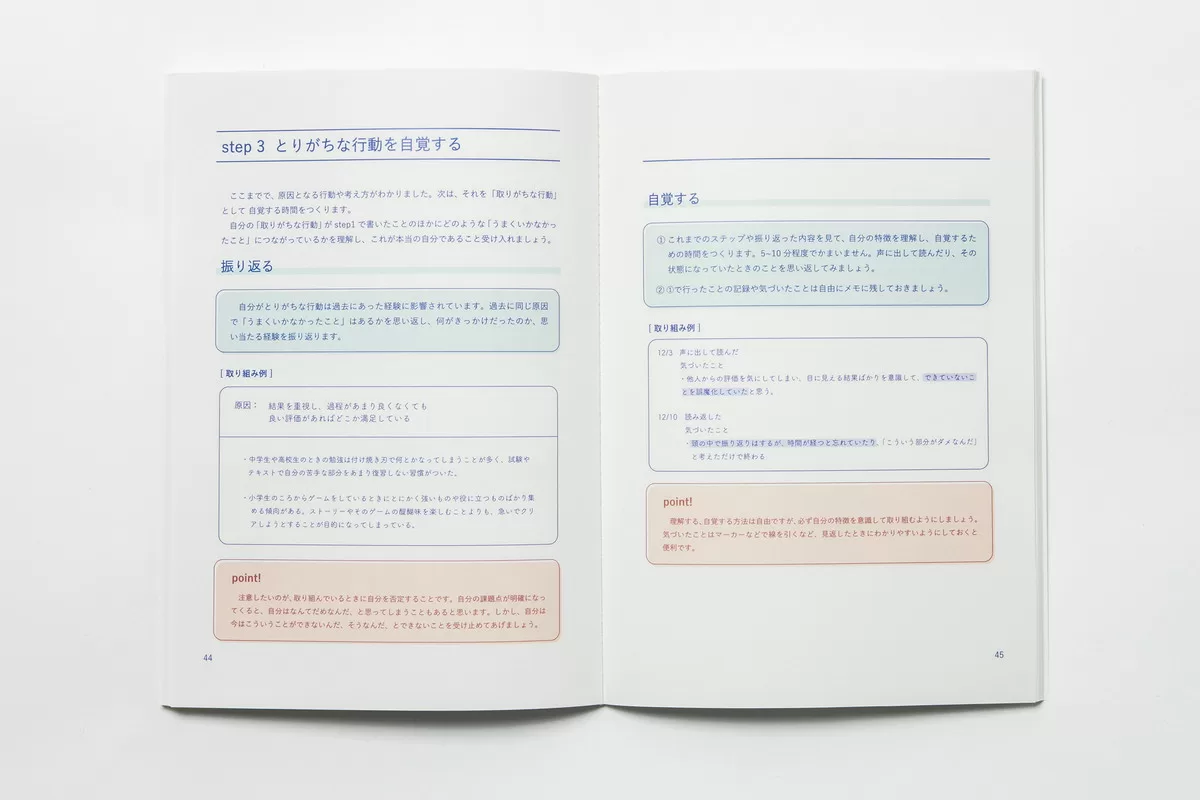 特に①に重点を置いています。まず、失敗したエピソードや気になることを掘り下げ、等身大の自分を受け入れていきます。その上で自分の改善したい事柄を明らかにし、自分に合った目標と取り組む事柄を見つけられるようにワークを組み立てています。