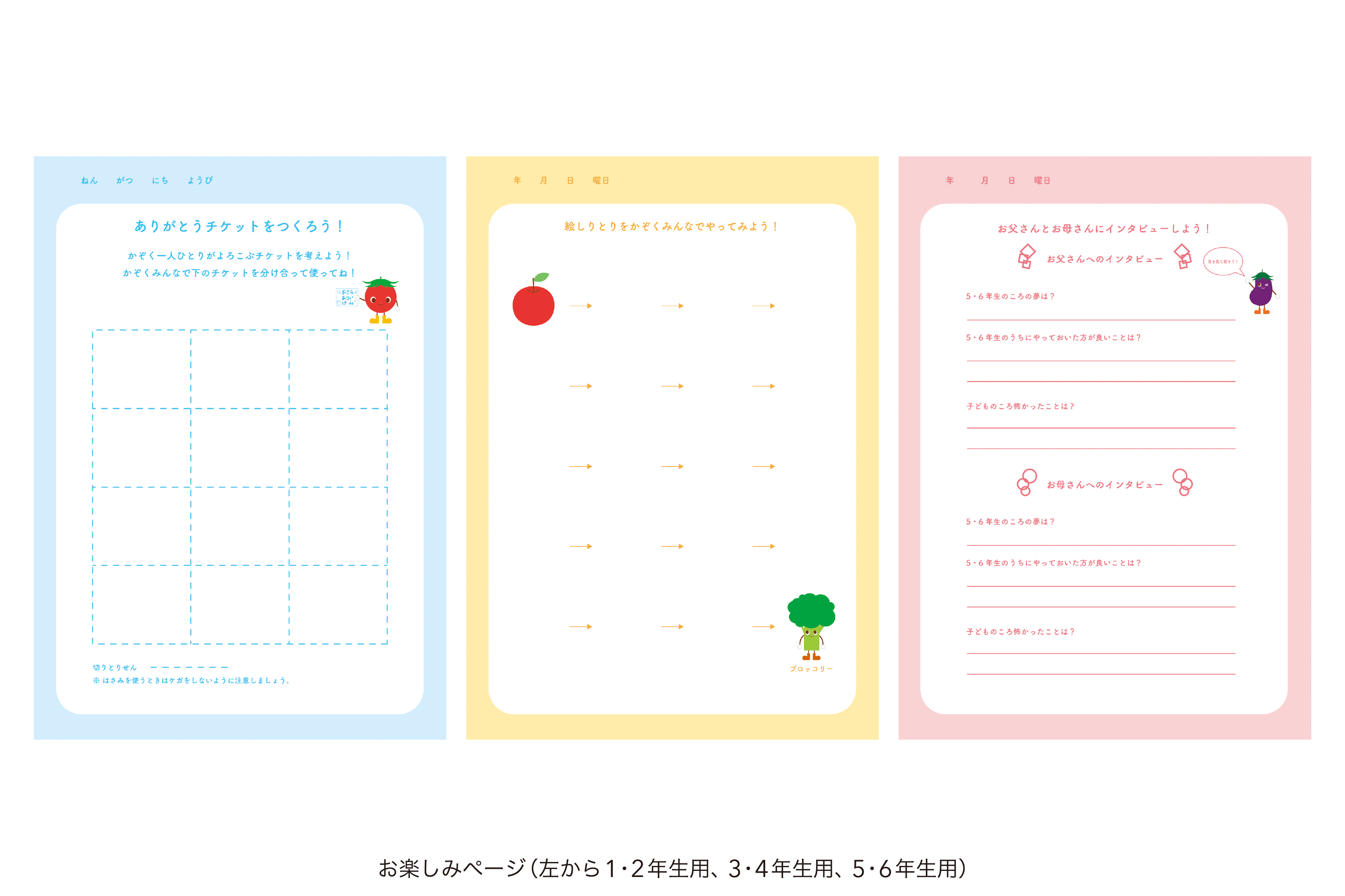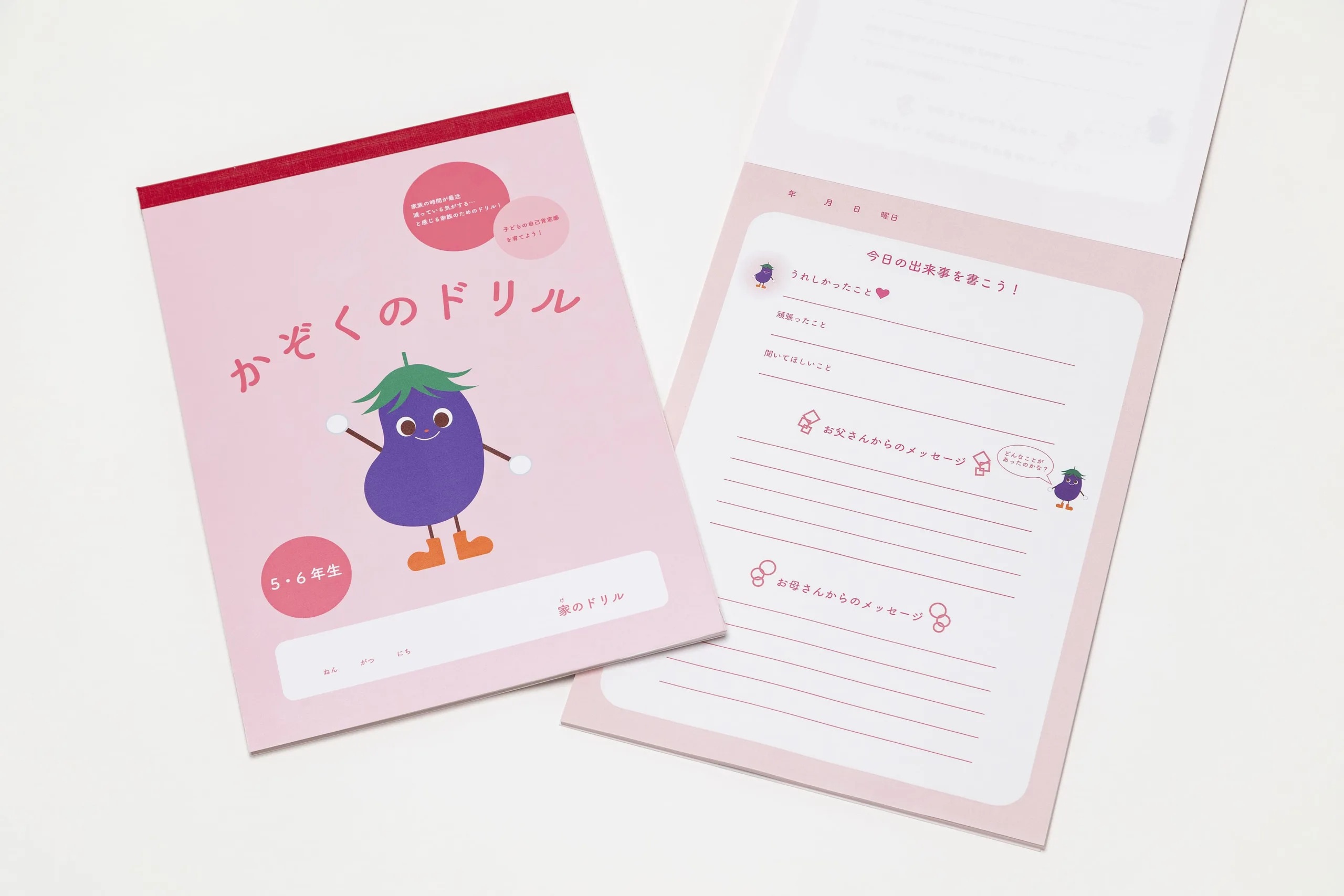 「かぞくのドリル」は、親子間の交換ノートのように日々の出来事を伝え合うページがメインになっており、子どもが設問に沿って答えたことに対し父親と母親それぞれがコメントを書けるようになっている。また、メインのページとは別に「ありがとうチケットをつくろう!」や「絵しりとりをかぞくみんなでやってみよう!」などの「お楽しみページ」も用意しており、このページも親子で一緒に取り組むことができる。