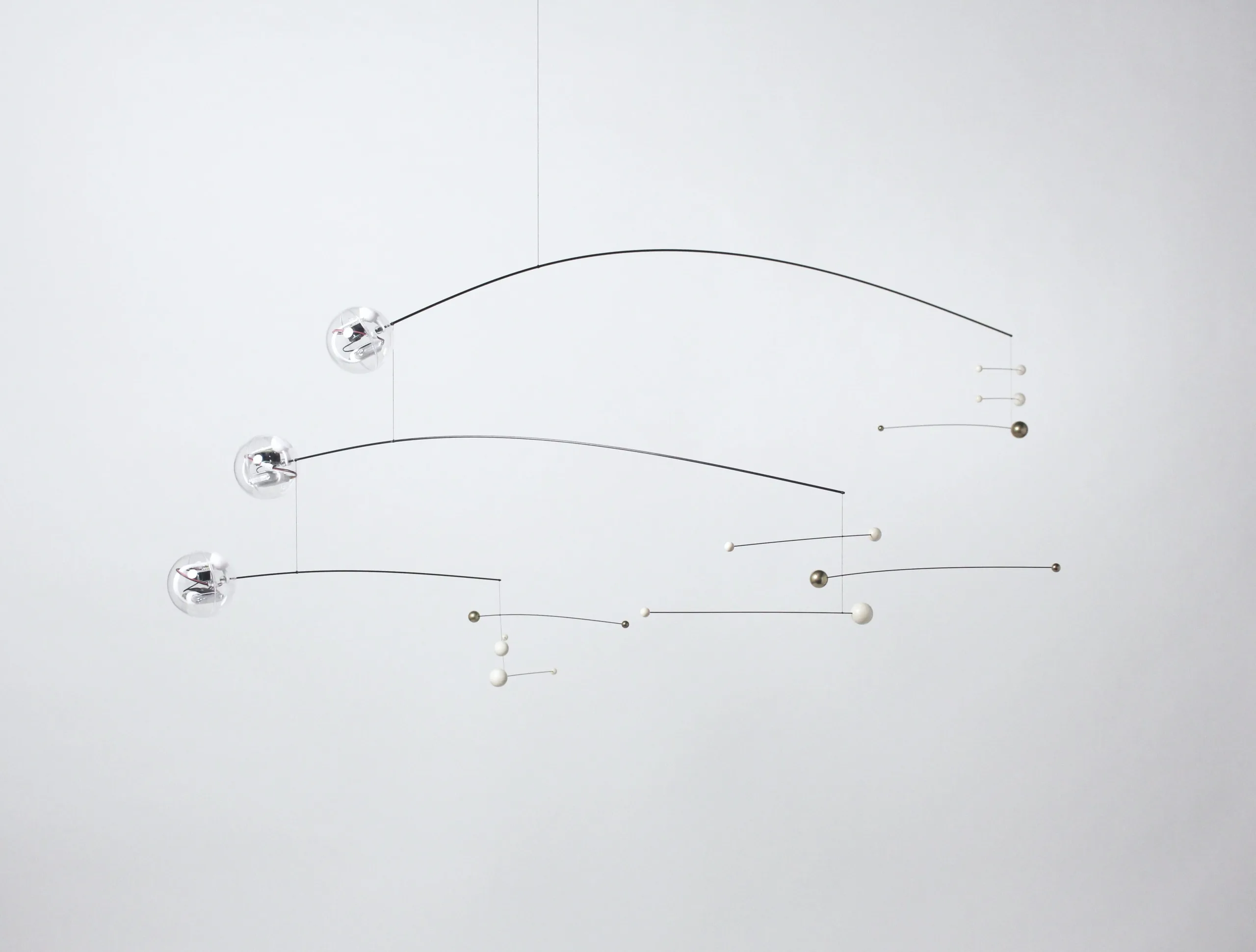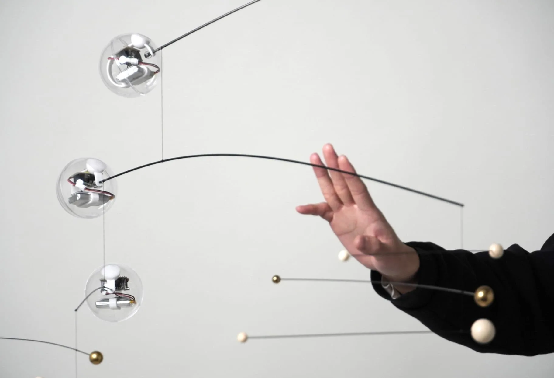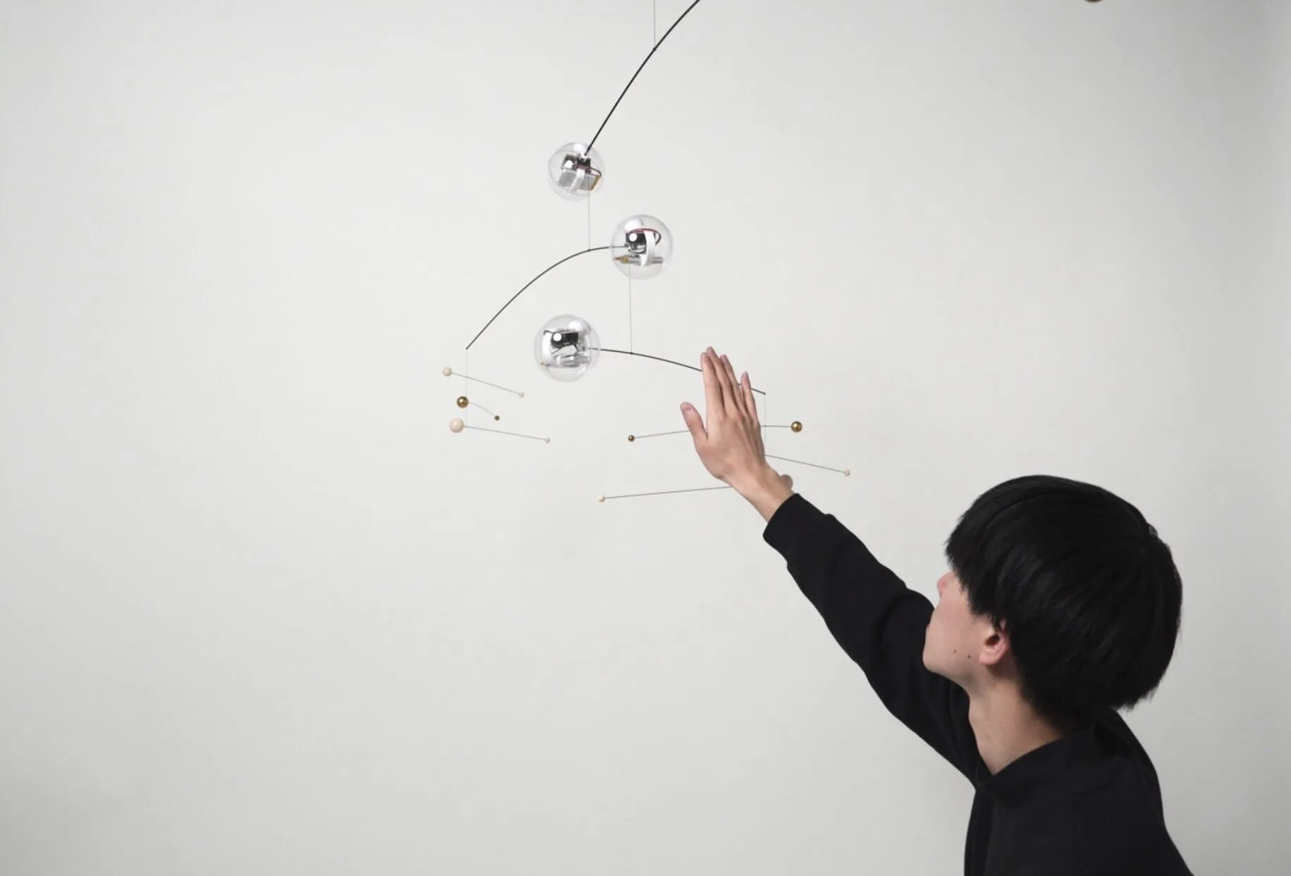 「yuragi tone」が風などで回転し始めると、透明なオーナメント内のセンサーが動きを検知します。すると、回転の速度に合わせて音程も変化していきます。透明なオーナメントは3つあり、低中高の3音がそれぞれ変化して曲を作ります。音の組み合わせがモビールの動きで無限に変化するため、同じ曲は2度と聞けず、意図の無い曲の心地よさを体験できます。