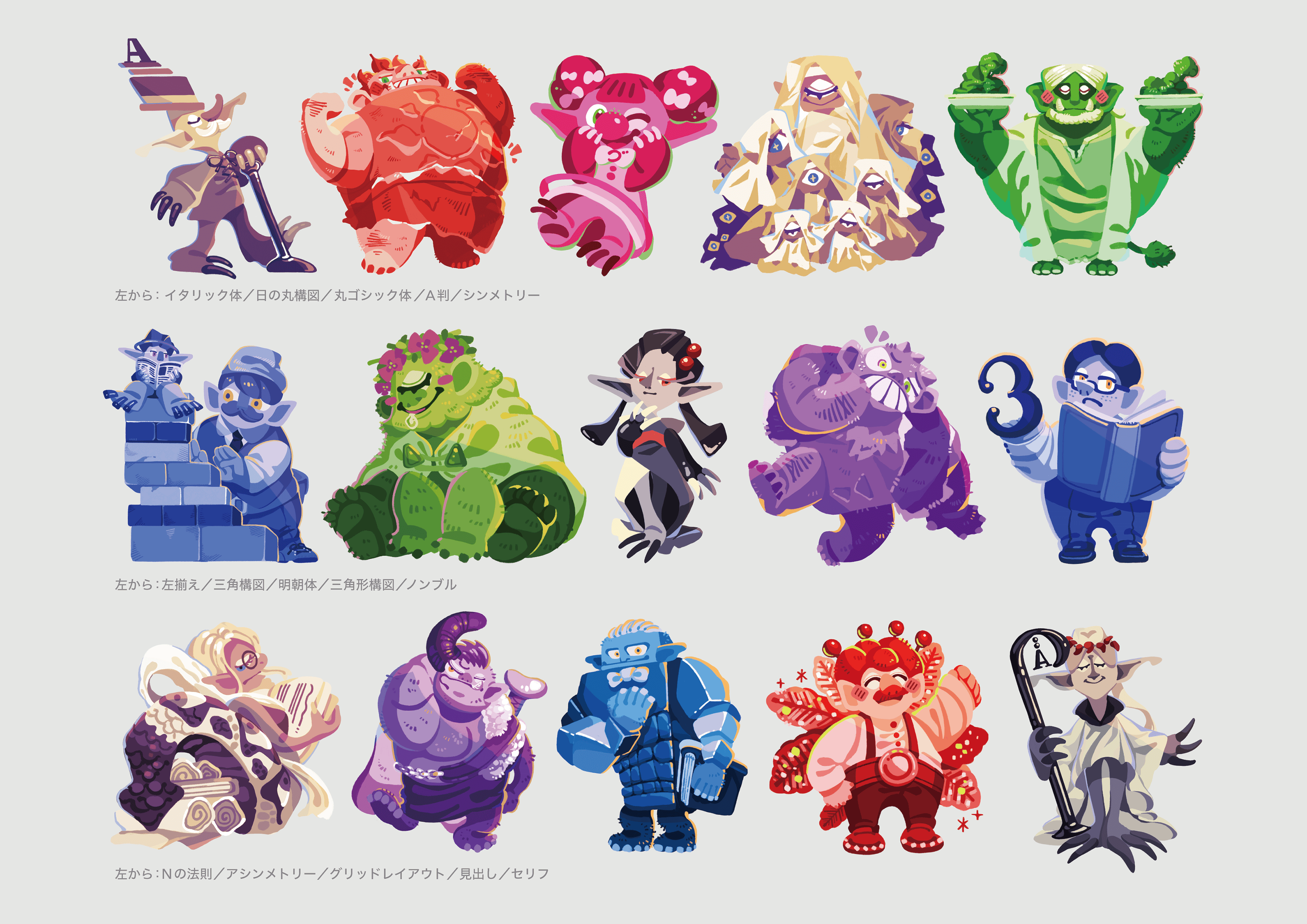 アンケート調査やグラフィックデザインに関する要素の分類、さらには、グラフィックデザインの学び方の調査から「グラフィックデザイン的作業の苦痛感と難しい雰囲気を減らす」「デザイン要素を組み合わせ、自分で作る力を育む」「グラフィックデザインに親しむ人を増やす」ことが重要であることがわかりました。そこで、グラフィックデザインで使用する要素を擬人化し、まるで友人になるような感覚でグラフィックデザインに親しめる妖精「グラーフィ」と、その生態をまとめた図鑑シリーズの企画を提案しました。
