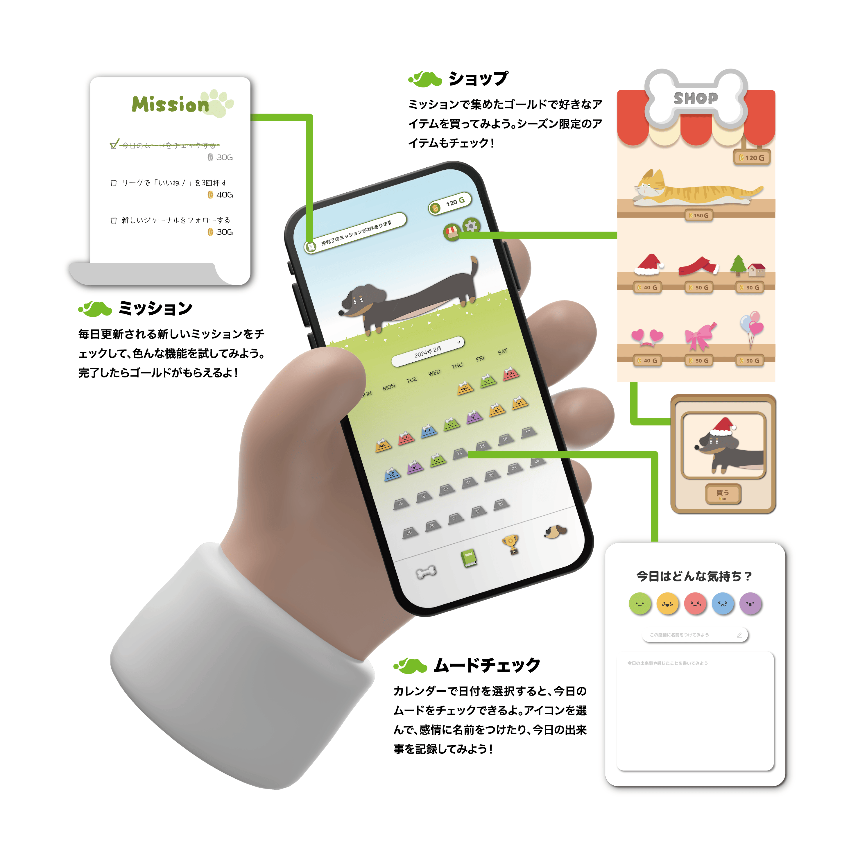 日記アプリ「Mooood」は毎日日記をつけることで犬のキャラクターにエサをあげることができ、ユーザーが自分のキャラクターを育成できる。ゲーミフィケーション(Gamification)を活用したことで、人々が日記をゲーム感覚で楽しめるように工夫した。