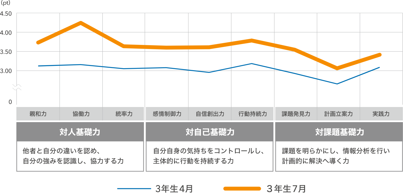 ※2018年の3年生4月と企画表現5が終了した7月に実施した結果をグラフ化しています。※PROG(プログ):大卒者が社会で求められる汎用的な能力・態度・志向(ジェネリックスキル)を測定し、育成するための河合塾とリアセックが共同開発したプログラムです。
