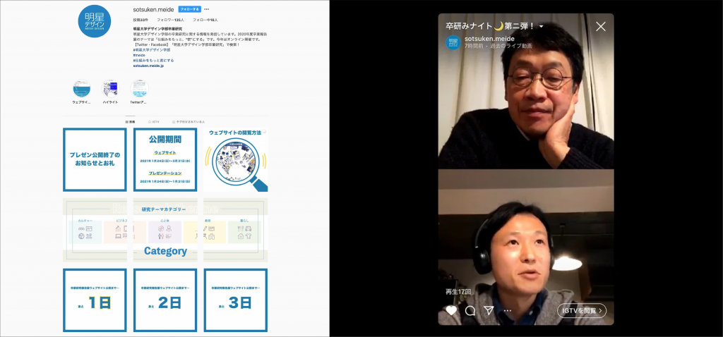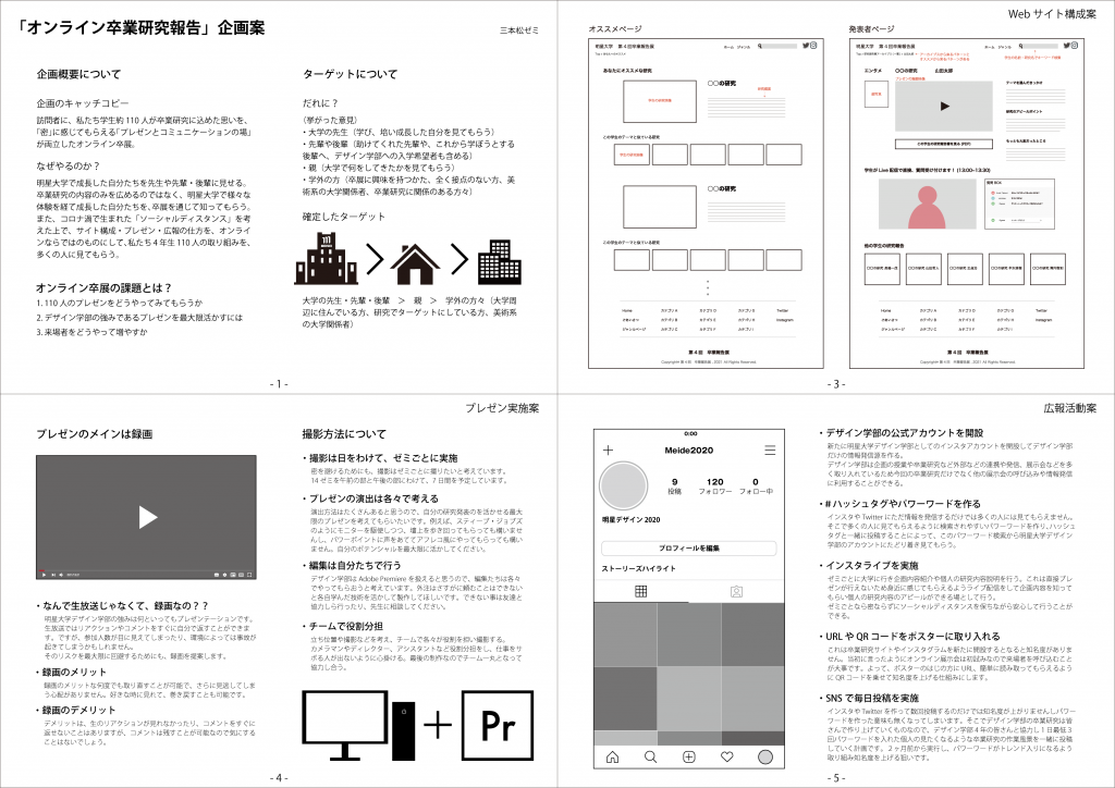 2021年1月24日にオープンした特設サイトでは、学生一人ひとりのテキストベースの研究報告とともに、プレゼンテーション動画を掲載(プレゼン動画は1月末、特設サイトは3月末で公開終了)。また、開催形式の変更にともない、SNSを通じた広報活動も開催前から積極的に展開しました。こうしたアウトプットのベースになったのが、マネジメントチームのリーダーを務めた足立達也さんと喜美侯部絢哉さんが所属する三本松淳助教のゼミの提案です。