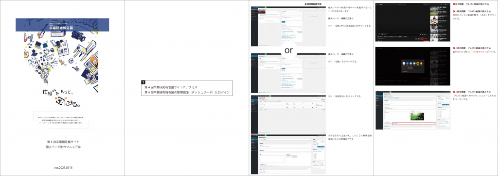 サイト公開に向けた準備では、学生一人ひとりが自らテキストを流し込み、収録したプレゼン動画をアップロードしました。ウェブに理解のある学生、そうではない学生と得手不得手があるなかで、100人超の学生がリモートでも間違いなくページを作成できるように、サイトコンテンツチームはページ作成のためのマニュアルづくりにも取り組んだといいます。