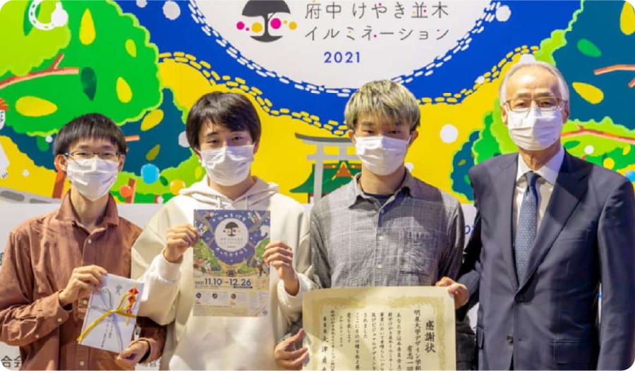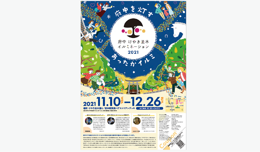 府中市の冬の風物詩となっているイベント「府中けやき並木イルミネーション」のロゴマーク、ならびにポスターやチラシ、動画といった広報ツールを、デザイン学部の学生がデザインしています。2022年度は子どもを対象としたイルミネーションに関するワークショップも開催しました。