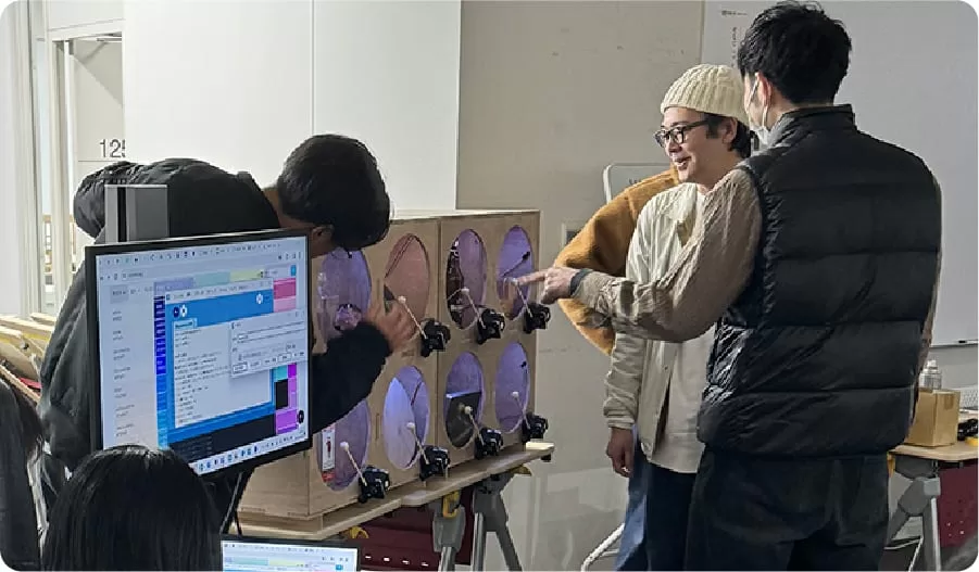 情報学部と共同で、情報技術を用いて物理的なサウンドを扱い、アルゴリズムを用いたリズム作りを体験できるワークショプを開催しました。Robotic Drum Machineを制作し演奏させることで、コンピュータへの理解を深めることができます。デザイン学部はRobotic Drum Machineを納める棚の制作を務め、木工CNCルーターShopBotを用いたワークショップを行いました。