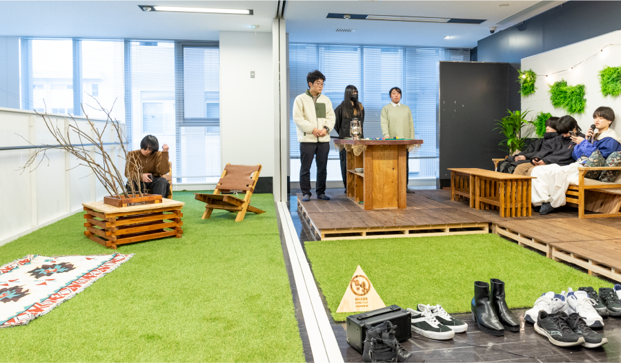 自宅や学校、職場などとは別の、居心地の良い第3の居場所「サードプレイス」に近年注目が集まっています。3年生後期の科目「デザインプロジェクト」では、「サードプレイス」を企画し、デザイン学部の校舎内に実際に制作・設置しました。また、それらを学内外に広く発信する活動も行いました。