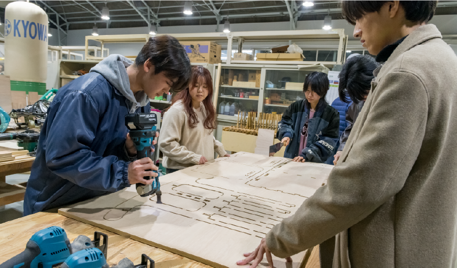 デザインプロジェクトとは、デザイン学部の学生が中心となり、他学部の学生や教員を巻き込みながら、学部を横断して実施するワークショップや課外活動のこと。「サードプレイス」に必要な什器や空間を企画・デザイン・制作に取り組みました。ワークショップでは、建築学科、福祉実践学科、情報学科とともに、「キャンパスを自分たちの居場所にするための複数人で利用できるスツール」のデザイン・制作・発表を行いました。