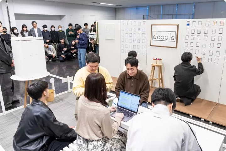 協働型プロジェクトとして、大学紹介冊子や新入生歓迎ゲームイベントといった2つのテーマを設定しチームで取り組みます。チームは2つのテーマを通じて同じメンバーで編成し、この活動を通じてデザインの現場で必要となる協働力の基礎を身につけていきます。